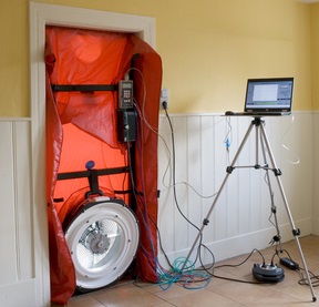 Un test d’infiltrométrie permet de mesurer l’étanchéité à l’air de votre bâtiment. Pour ce faire, un ventilateur est placé dans la porte d’entrée et permet de mettre le bâtiment en dépression (puis en surpression) sous une différence de pression de 50 Pa.